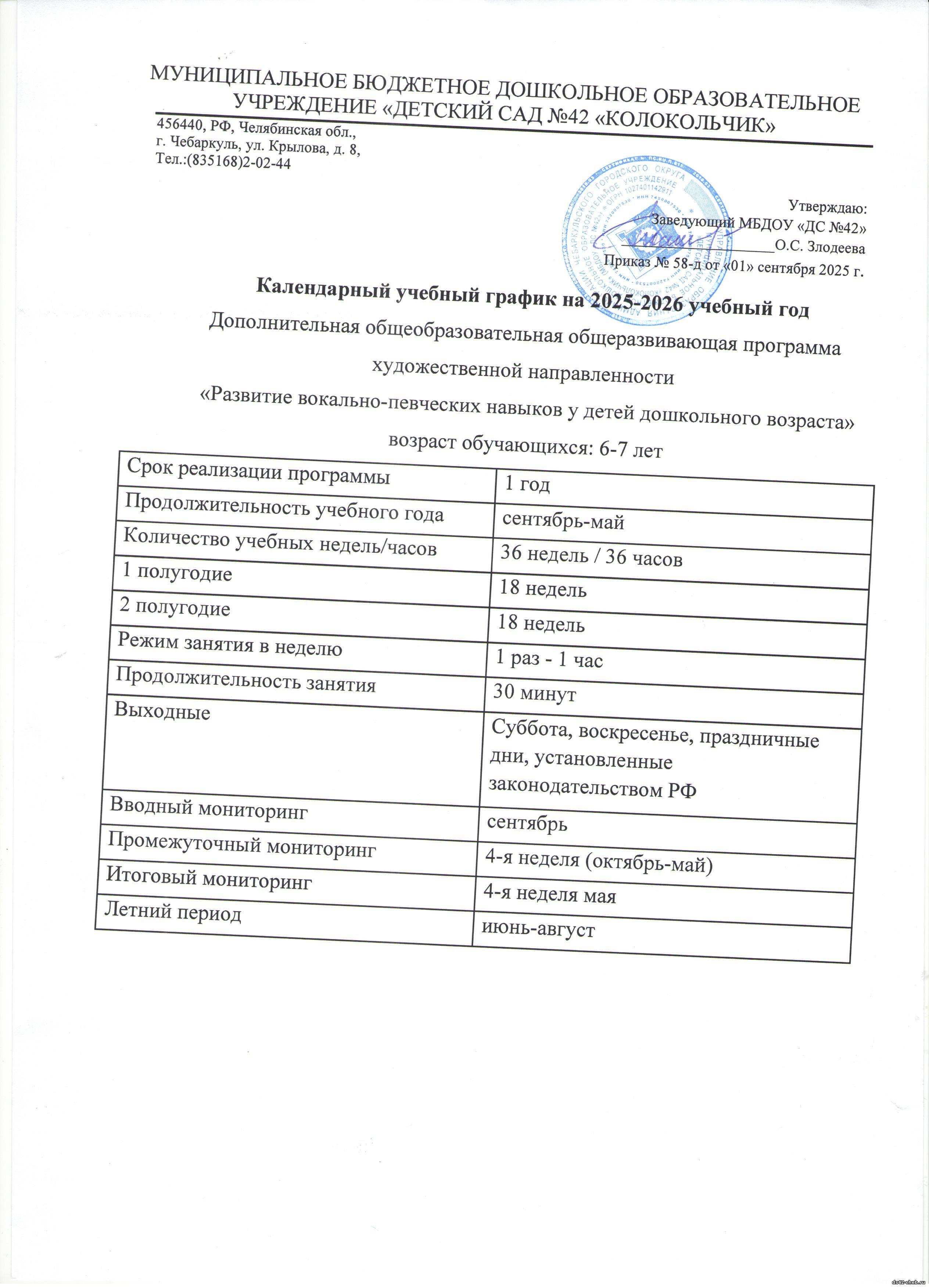 Календарный учебный график на 2025-2026 учебный год Дополнительная общеразвивающая программа художественной направленности "Развитие вокально-певческих навыков у детей дошкольного возраста 6-7 лет"