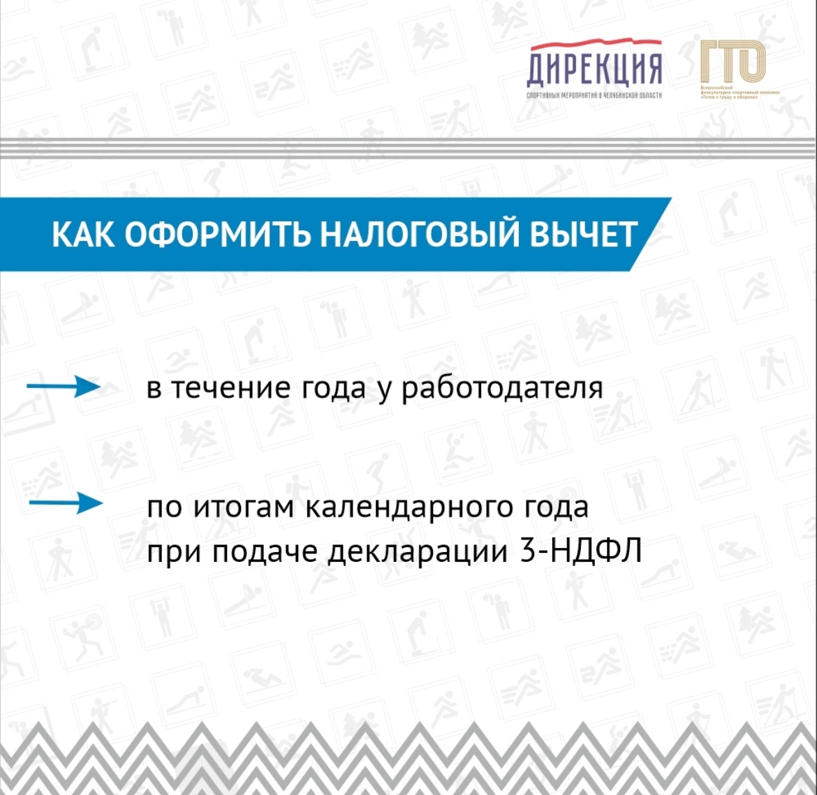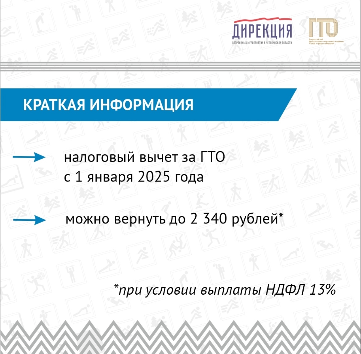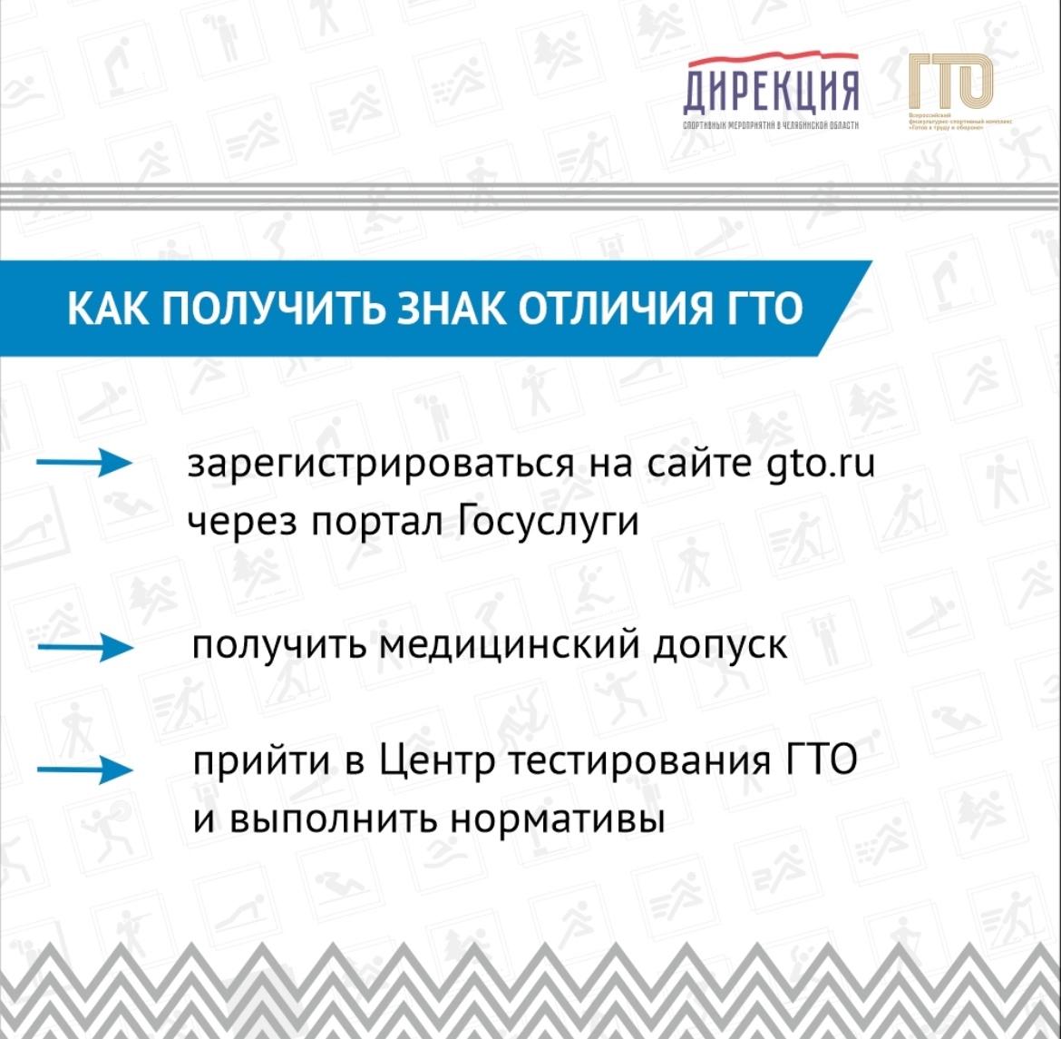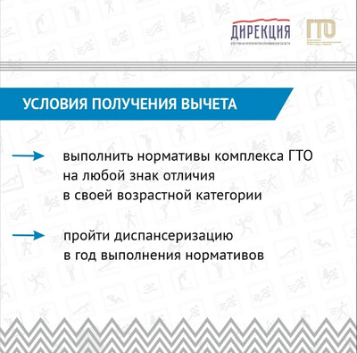 С 2025 года граждане, выполнившие нормативы испытаний комплекса «Готов к труду и обороне» и прошедшие диспансеризацию, смогут получить стандартный налоговый вычет по налогу на доходы физических лиц. Как оформить вычет смотрите в карусели Для того, чтобы присоединиться к движению ГТО, необходимо зарегистрироваться на сайте gto и получить уникальный идентификационный номер (УИН). Определить испытания, соответствующие возрастной ступени и полу. Нормативы можно выполнить в центрах тестирования. Чтобы приступить к испытаниям, требуется предоставить документ, подтверждающий личность и медицинскую справку. При успешном выполнении всех нормативов «Готов к труду и обороне» участники будут представлены к награждению золотыми, серебряными и бронзовыми знаками отличия ГТО. | |
