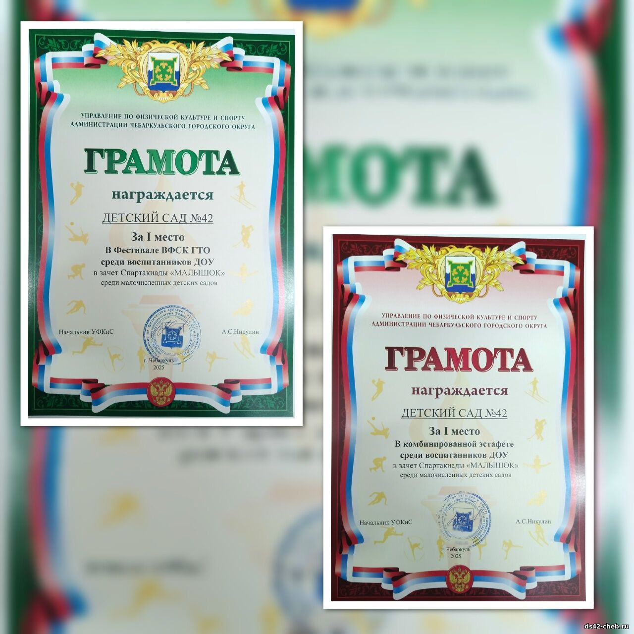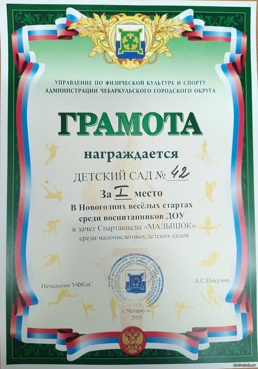 Завершилась Спартакиада среди воспитанников детских садов "МАЛЫШОК-2025". Наш детский сад принял участие в завершающем этапе - Новогодние весёлые старты. Поздравляем нашу спортивную команду с 1 местом в Новогодних весёлых стартах среди воспитанников ДОУ и с 1 местом в Спартакиаде среди воспитанников дошкольных образовательных учреждений "МАЛЫШОК". Наш детский сад получил грамоту и кубок! А также наш детский сад был награждён: Поздравляем с победой! Желаем дальнейших спортивных побед! | |